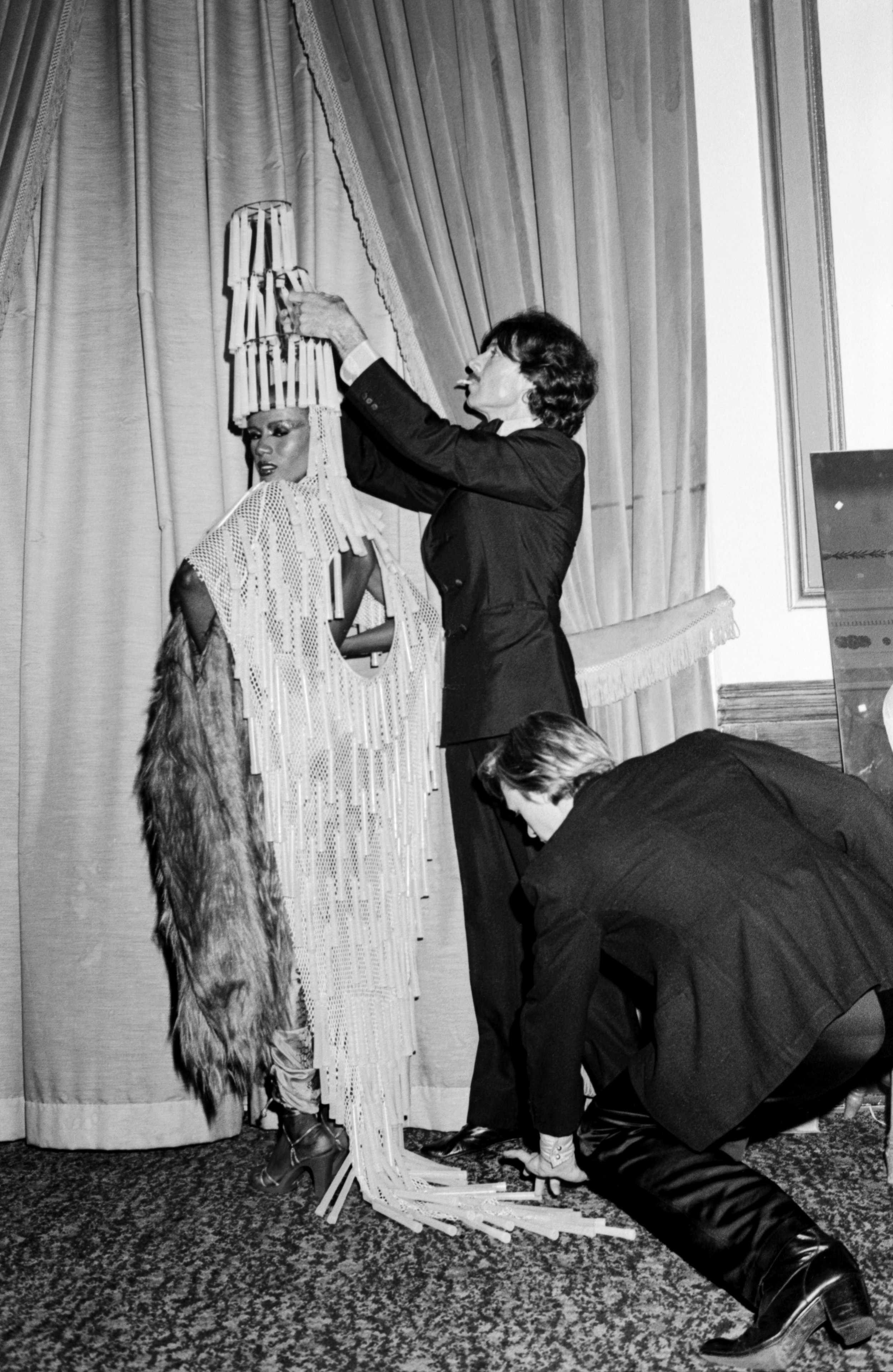 Supermodel Grace Jones poses while Richard Bernstein (designer, Interview magazine) adjusts her runway look for the Erte’-inspired Ziegfeld Follies Ball at the Metropolitan Club.